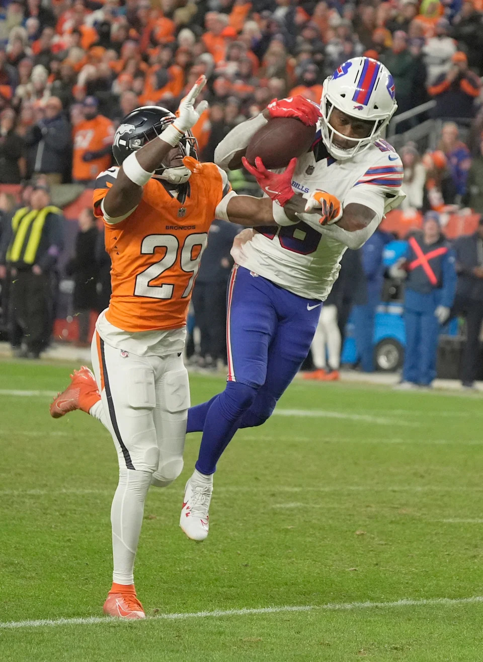 Ja’Quan McMillian of the Denver Broncos and Brandin Cooks of the Buffalo Bills during overtime in the AFC Divisional Playoff game at Empower Field At Mile High.