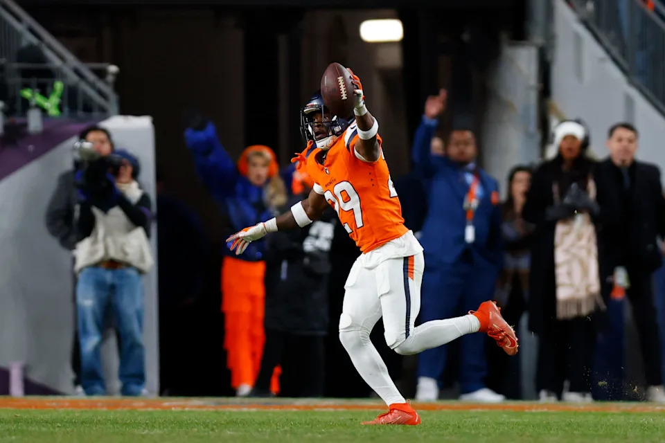 Ja’quan McMillian of the Denver Broncos celebrates after pulling the ball from Brandin Cooks.