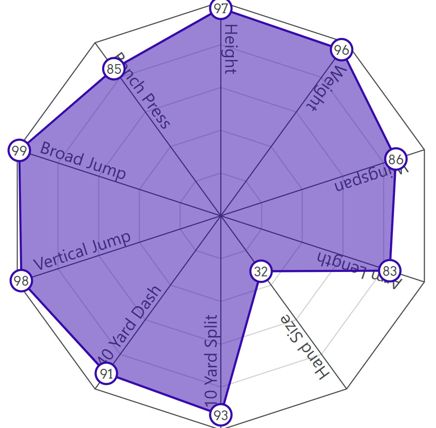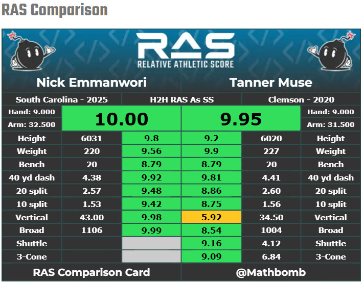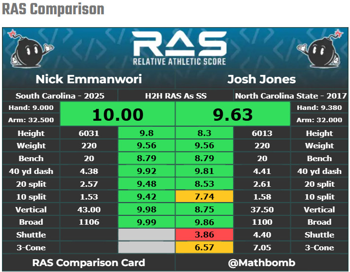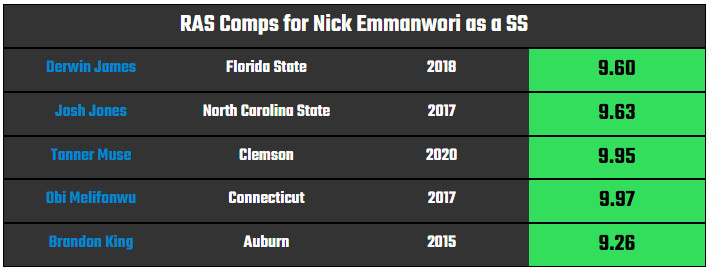 Nick Emmanwori set the world on fire with a perfect 10.00 RAS with a 4.39 40 and 43” vert at 6’3”, 220lbs.