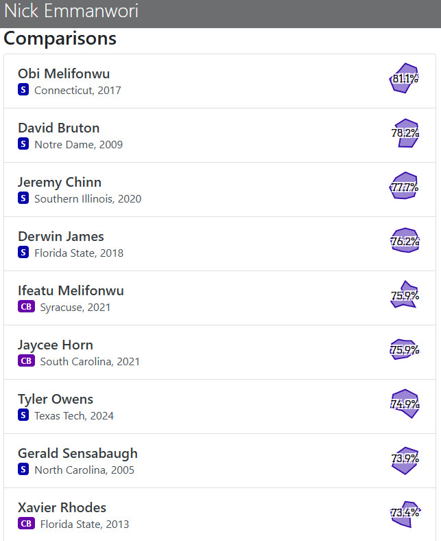 Emmanwori’s comps are littered with some worrying names, particularly Obi Melifonwu who appeared on both the Mockdraftable and RAS lists. He was another ultra athletic safety, yet was out of the NFL after a few seasons.