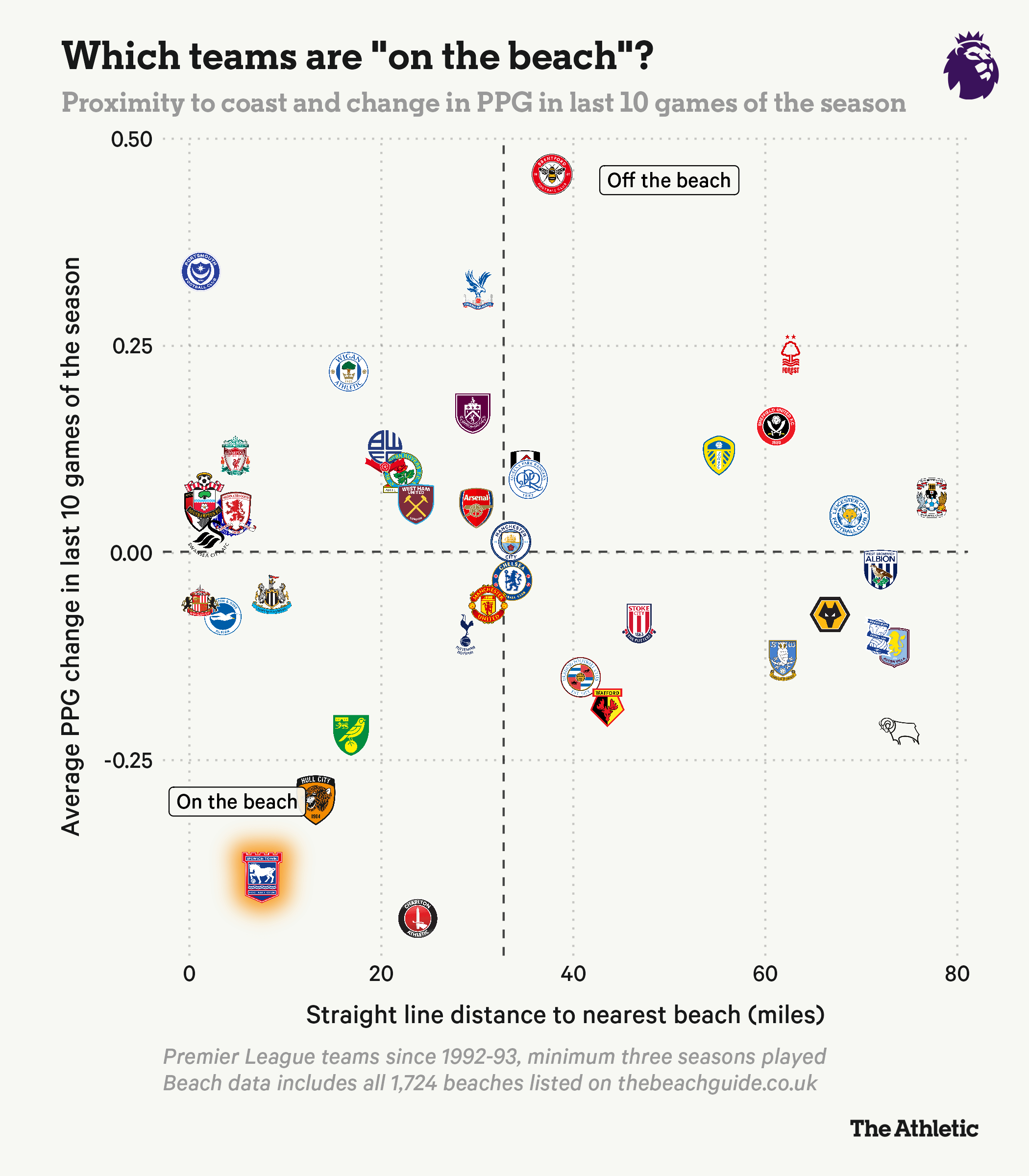 Looking at the scatter graph below, Ipswich Town tick both on-the-beach criteria, dropping 0.4 more PPG on average in the final stretch of the season, while being geographically close to Felixstowe Beach.