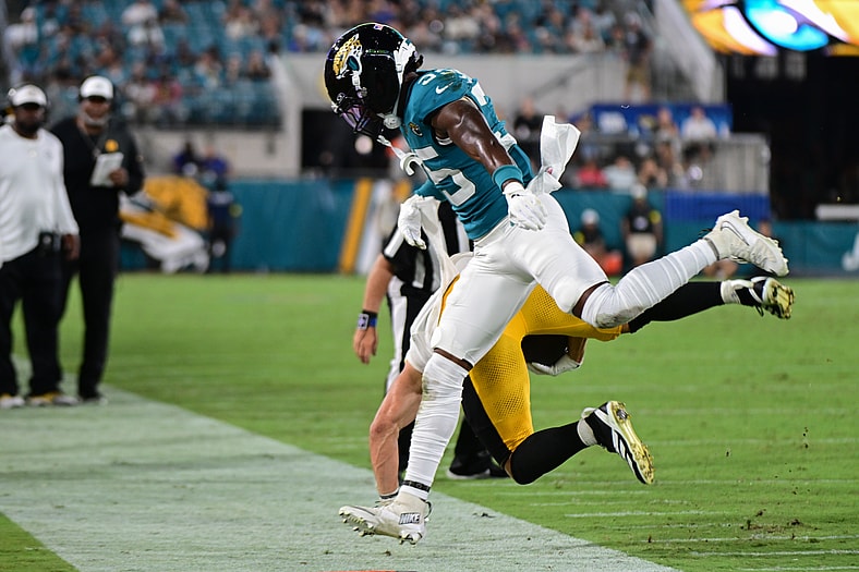 Jacksonville Jaguars defensive back Doneiko Slaughter in a game against the Pittsburgh Steelers on Aug. 9, 2025 — Ed Thompson / Steelers Now