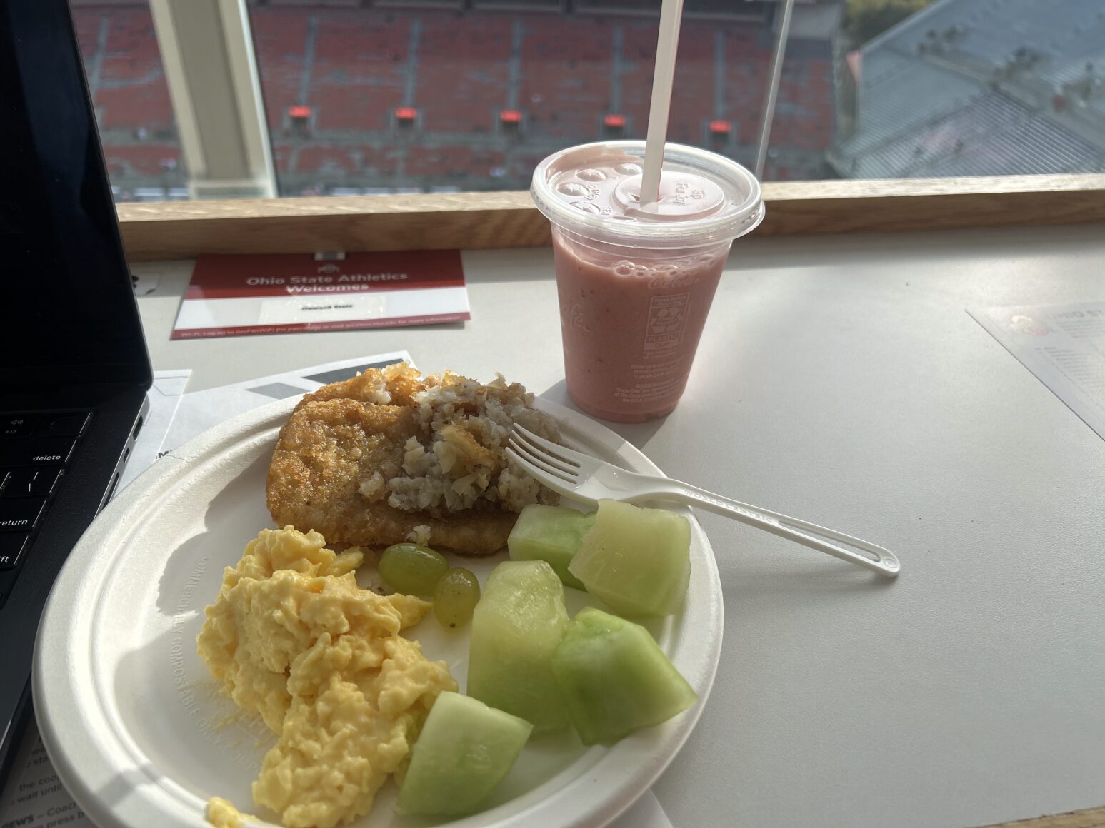 It was a noon kick in Columbus, so the lovely Ohio Stadium staff rolled out an all-you-can-eat breakfast buffet for us. While it was a simple eggs, potatoes, and fruit buffet, it didn’t knock my socks off; the ALL-YOU-CAN-DRINK MCCAFÉ SMOOTHIES DID.