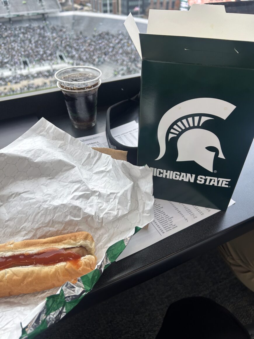 Michigan State had a weird voucher system for visiting journalists. We received one voucher that was only good for concession items within the stadium and the concession stand in the press box. That’s where the issue lies. Why is a concession stand the food source in the press box? I want food, not snacks.