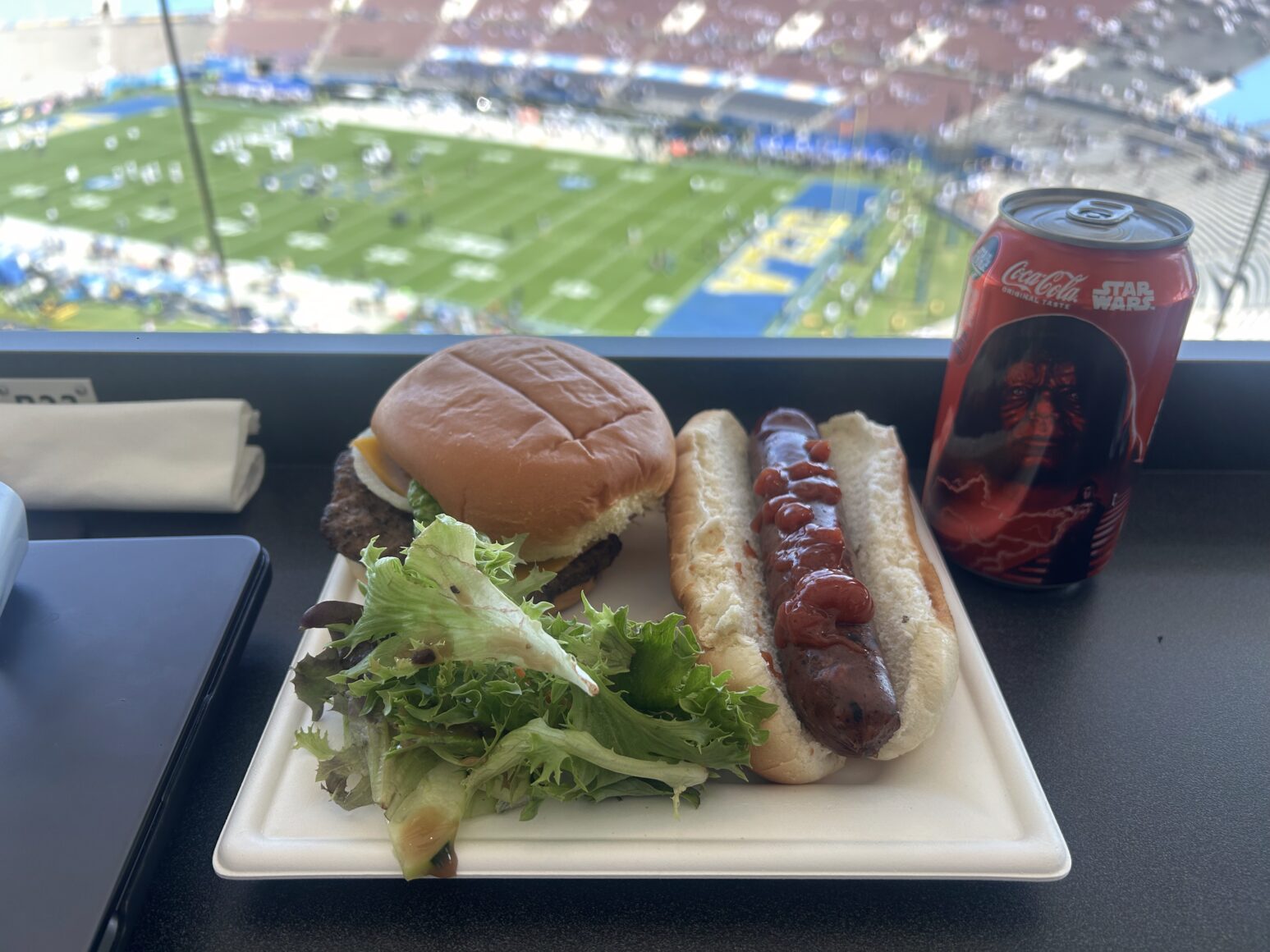 I took a burger, a hot dog, and some greens before kickoff. Drinks were readily available in large fridges near the back of the press box. While the food was good, there was still something off about it that I can’t put my finger on to this day. The sausage was incredibly hard to chew. The burger was the most average burger I’ve ever had.