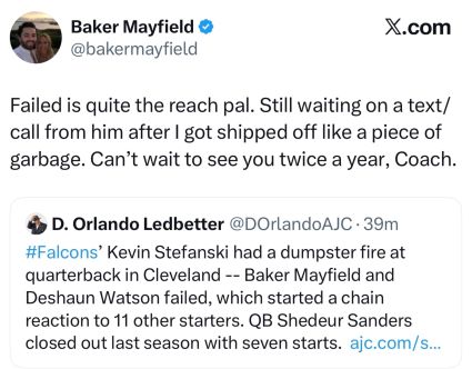 It seems Joe’s good friend D. Orlando Ledbetter of the Atlanta Journal-Constitution inadvertently caught a stray, getting under Mayfield’s skin with an innocent twitter yesterday and Mayfield turned that into a blast at new Dixie Chicks coach Kevin Stefanski, who was Mayfield’s coach for his last two seasons in Cleveland.