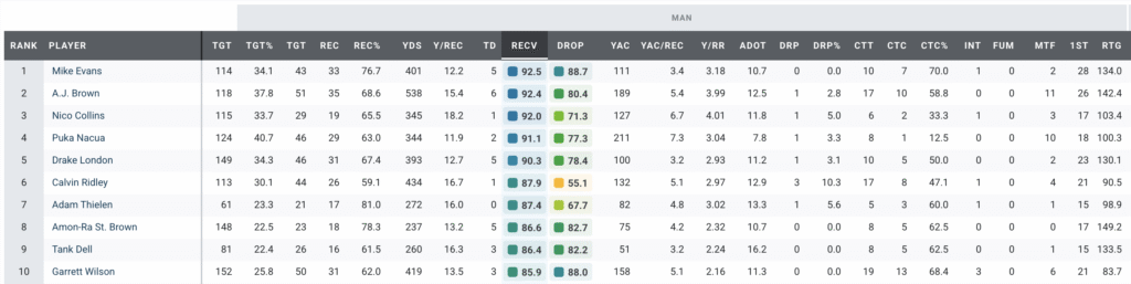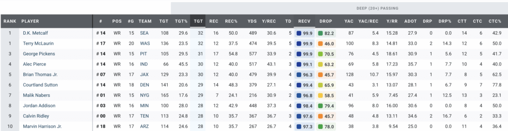 Some might argue Smith-Njigba deserves a higher spot on this list. And in certain areas, such as his 97.2 receiving grade against zone coverage and strong yards-after-the-catch production, the case is there. However, his 78.7 grade against single coverage falls short compared to others ranked ahead of him. That said, this isn’t a knock on his talent; he’s a highly skilled receiver with the potential for a breakout year in Seattle’s new offense.