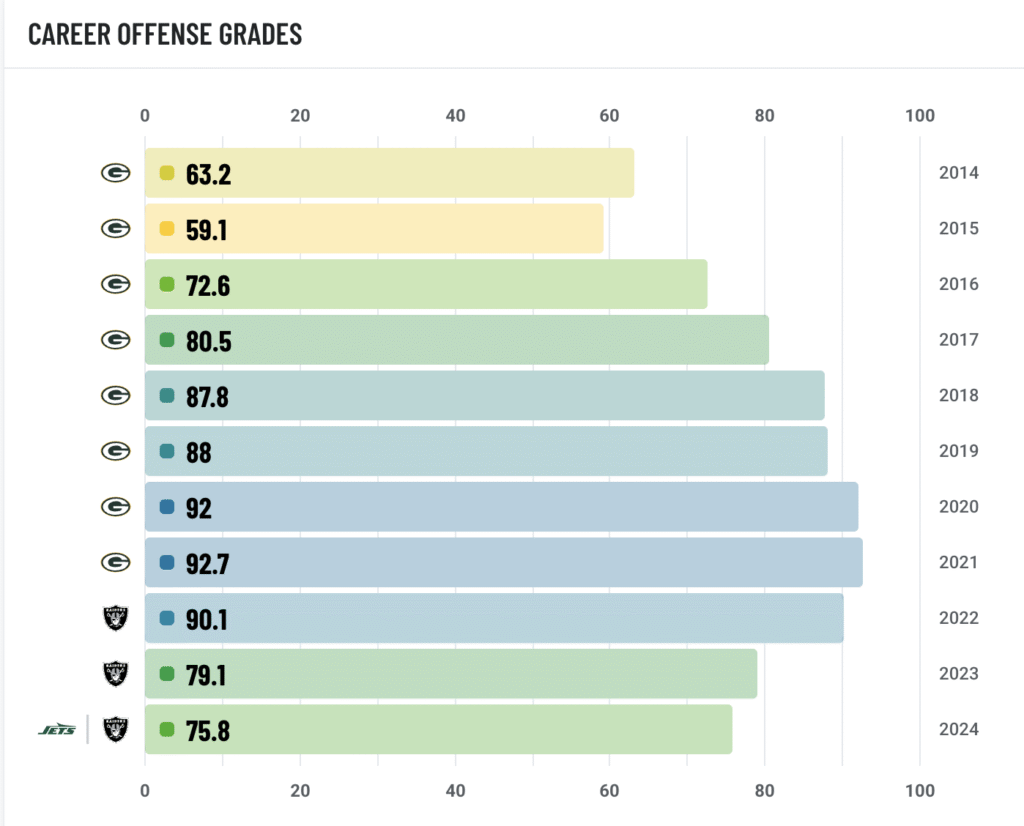 Sutton has been a model of consistency for the Broncos. Since 2019, he has earned a receiving grade below 70.0 only once (69.7 in 2022), but he’s also surpassed the 80.0 mark just once (2020). With Denver’s offense expected to take a step forward in 2025, this could be Sutton’s most productive season yet.