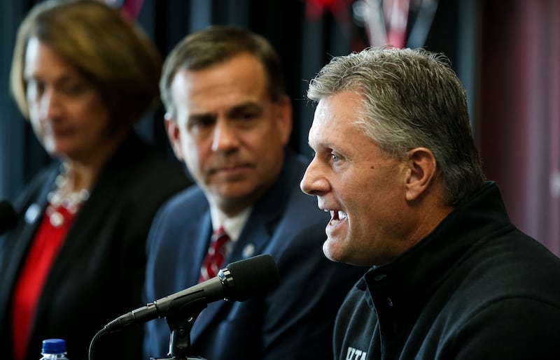 University of Utah head coach Kyle Whittingham speaks about the planned expansion of Rice-Eccles Stadium during a press conference at the stadium in Salt Lake City on Wednesday, Nov. 14, 2018. At left is University of Utah President Ruth Watkins and athletic director Mark Harlan. | Spenser Heaps, Deseret News
