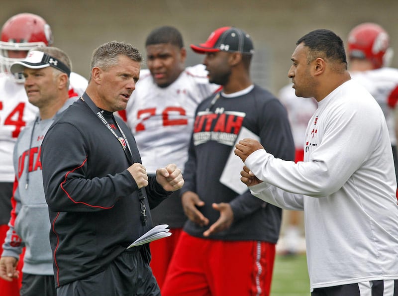 Utah coach Kyle Whittingham, left, and defensive coordinator Kalani Sitake during Utah football practice Thursday, April 5, 2012, in Salt Lake City, Utah. | Tom Smart, Deseret News archives