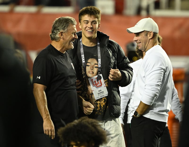 Recruit Bode Sparrow talks with Utah Utes head coach Kyle Whittingham and Morgan Scalley as Utah and Cincinnati prepare to play at Rice-Eccles Stadium in Salt Lake City on Saturday, Nov. 1, 2025. | Scott G Winterton, Deseret News Whittingham’s decision muddied the waters