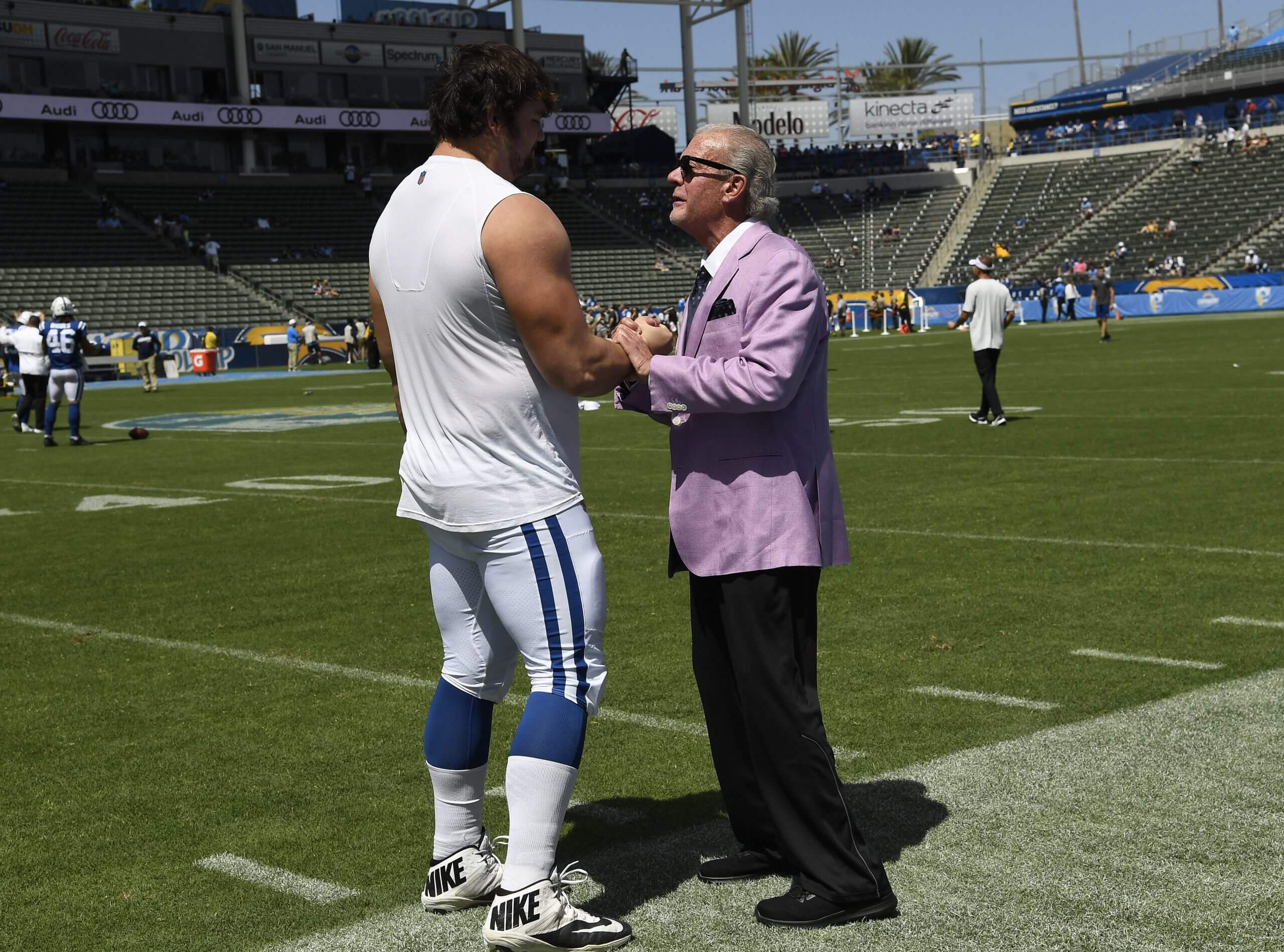 Jim Irsay speaks with Colts guard Quenton Nelson before a 2019 game in Carson, Calif. (Kevork Djansezian / Getty Images)