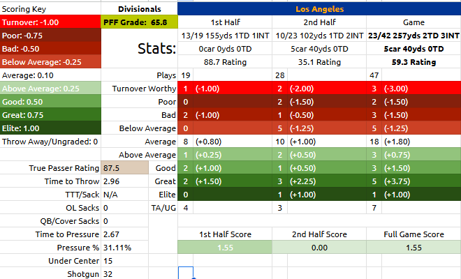 NFL Passer Rating / True Passer Rating / PFF Grade: 59.3 / 87.5 / 65.8The average passer rating in the 2025 season sits at 91.4 for the 2025 NFL regular season. His 59.3 NFL Passer Rating would be considered a poor game.I’ve gone on ad nauseam about my dislike of the NFL passer rating, a 59.3 rating would lead you to believe Caleb was not effective at all in Sunday’s game, but he quarterbacked an offense that outgained, out possessed, and gained more 1st downs than the Rams. It had zero sacks and went nearly 50% on 3rd down.For comparison Matthew Stafford put up a 67.4 rating, which would tell you he had a better game, but in head-to-head comparison using grading metrics like ESPN’s QBR (31.6 for Stafford, 72.2 for Williams) and PFF grading system (42.2 for Stafford, 65.8 for Williams) it pains a MUCH better picture of these quarterbacks impact on the game, and the film backs that up.A 87.5 TPR is a Below Average game, with 100 serving as the baseline for “Average.”We also see a bit of a flaw in my personal metric as well, an 87.5 TPR would be backup level performance. When I created TPR I really wanted to stick to using at-fault turnovers alongside at-fault sacks, the main issue with that is if I’m going to be using TPR as a league wide metric, accurately, I would need to time to assess ALL interceptions thrown to deduce at fault turnovers. (Which is a can of worms in itself as that is subjective in itself, football will forever be a game impossible to quantify by a formula alone.)On the PFF scale, a score of 60 or higher is considered an Average game. With a 65.8 PFF Score, Caleb Williams’ performance was graded as solidly average.This aligns almost exactly with my grading, with a 1.55 being a solidly average game as well. Sometimes PFF can be a decent resource when it comes to their grading.On-Target Throws: Regular Season Average: 67.6% | Divisional vs. Rams: 73.2%Reminder: Completion % ≠ On-Target %. On-target throws are only counted on aimed passes, so throw aways, spikes, and deflections at the line aren’t counted. And drops are counted as on-target.Short-Level Passing (Behind LOS – 9 yards): 21/27 | 77.8% On-TargetDeep-Level Passing (10–20+ yards): 9/14 | 64.3% On-TargetA 77.8% On-Target rate would put him in the top 10 of the NFL it that were his season long number, as Williams continued to steadily improve his accuracy to end the year. Dating back to week 12 he had just two games sub 70% On-Target (67.9% in Philadelphia and 69.0% against the Packers in the Wildcard round.) Caleb talked about improving accuracy and footwork this offseason, but it’s comforting to know his accuracy has already taken a huge leap in the second half of the year.PPR/BPR: 10.6% Poor Play Rate (poor + turnover worthy graded plays) against a 12.8% Big Play Rate (great + elite graded plays)As mentioned earlier, his 12.9% BPR in the post-season nearly doubled his 7.6% mark in the regular season, fueled by 11 Great plays graded, and 2 Elite. He accounted for 339 yards of offense a game in his first trip to the post-season.And while his turnover worthy % did jump (1.97% -> 2.97%), I’m not too concerned over it due to sample size, and historical data backing Caleb’s ability to avoid turnovers. He’s only going to get better there in future playoff games.Time to Throw: 2.96s against the Rams this week.6 of Caleb’s last 9 starts have seen a time to throw sub 3 seconds, which is essentially the mirror opposite of his first 10 starts in 2025, which saw 6 of those 10 being North of 3 seconds time to throw.To me this speaks to a few things, comfort within the offense, and decisiveness and willingness to throw within structure more often.Turnovers: 5 total interceptions in 2 playoff games seems like an insane amount as we saw Caleb legitimately set records for his ability to protect the ball in the air in the last 2 seasons. But I think the craziest thing of that is 4 of those interceptions you could make legitimate claims that Caleb had either no blame in or partial blame can be placed on his receivers.4th down interception on a pass intended for Luther Burden: on an Deep In requiring anticipation, Burden goes rogue, throwing up the mailbox, Caleb doesn’t see it, throws to where Burden should be if he were running the Deep In.4th down interception on a pass intended for Cole Kmet: The play’s designed receiver DJ Moore, slipped on the goal line, on what would have been an layup touchdown. Caleb is forced to extend the play and with pressure baring down, throws up a prayer that gets intercepted.2nd interception against the Rams: The Bears were running a Smash concept, which requires the underneath receiver to run a Stick route while the primary receiver runs as Corner. In situations where the underneath receiver reads man coverage, he can option that to a shallow In, to drag that underneath defender with him, making the throw to the Corner a lot cleaner. The Rams, unfortunately were in Zone, Loveland ended up freeing up his defender, which allowed the defender to drift back into the Corner route Luther Burden was running, causing the interception.The throw I outlined above that included a breakdown by Chase Daniel.The only throw I place full blame on Caleb is his 1st interception against the Rams, a throw that was too high on a open Colston Loveland. In any case, they all resulted in missed opportunities, something I’m sure the Bears will focus on moving into the 2026 season.