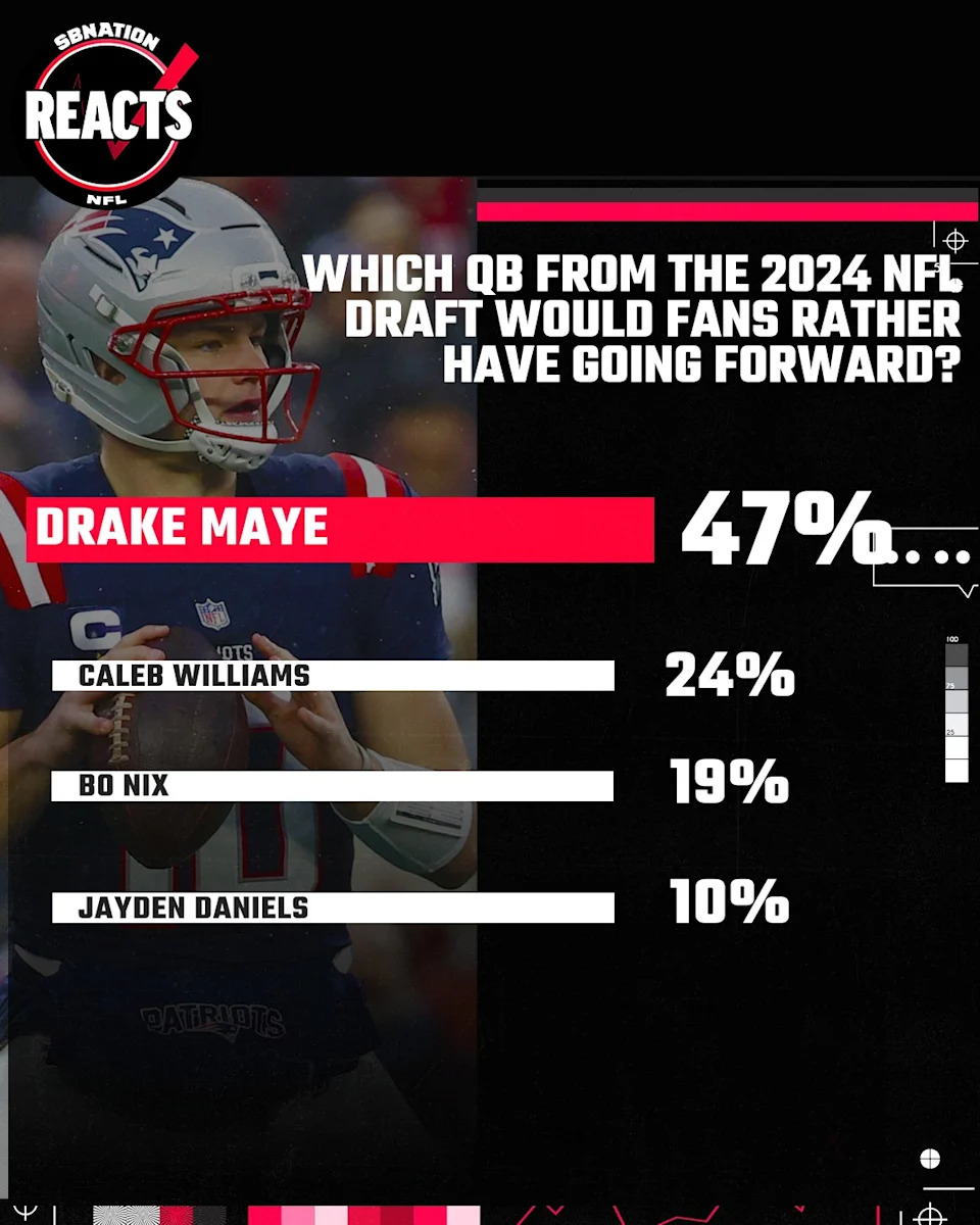 “Which quarterback from the 2024 NFL Draft would you rather have going forward?” was one of several questions that went out to a national audience, and I’m not surprised that Drake Maye led the vote with 47%.