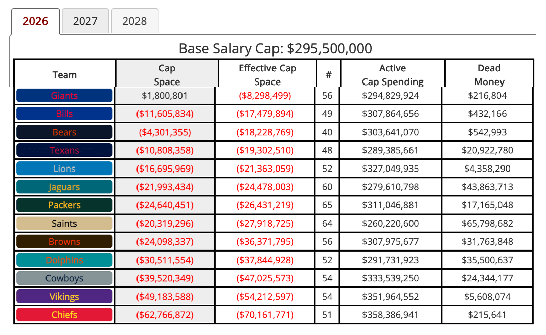 The Giants are one of 13 teams whose effective cap space (i.e., cap space after signing their 2026 draft class) is negative. You can see though that they are “in the red” by a measly $8.3M. Pity those teams at the bottom like the Chiefs who have to fill a $70.1M hole.