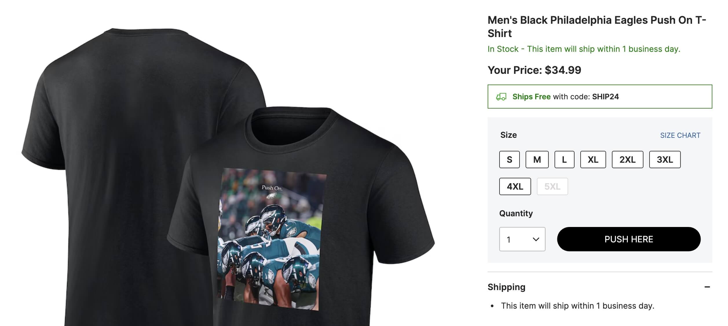 The new T-shirt and “push here” button on the Eagles shop. (Image: Philadelphia Eagles Pro Shop)