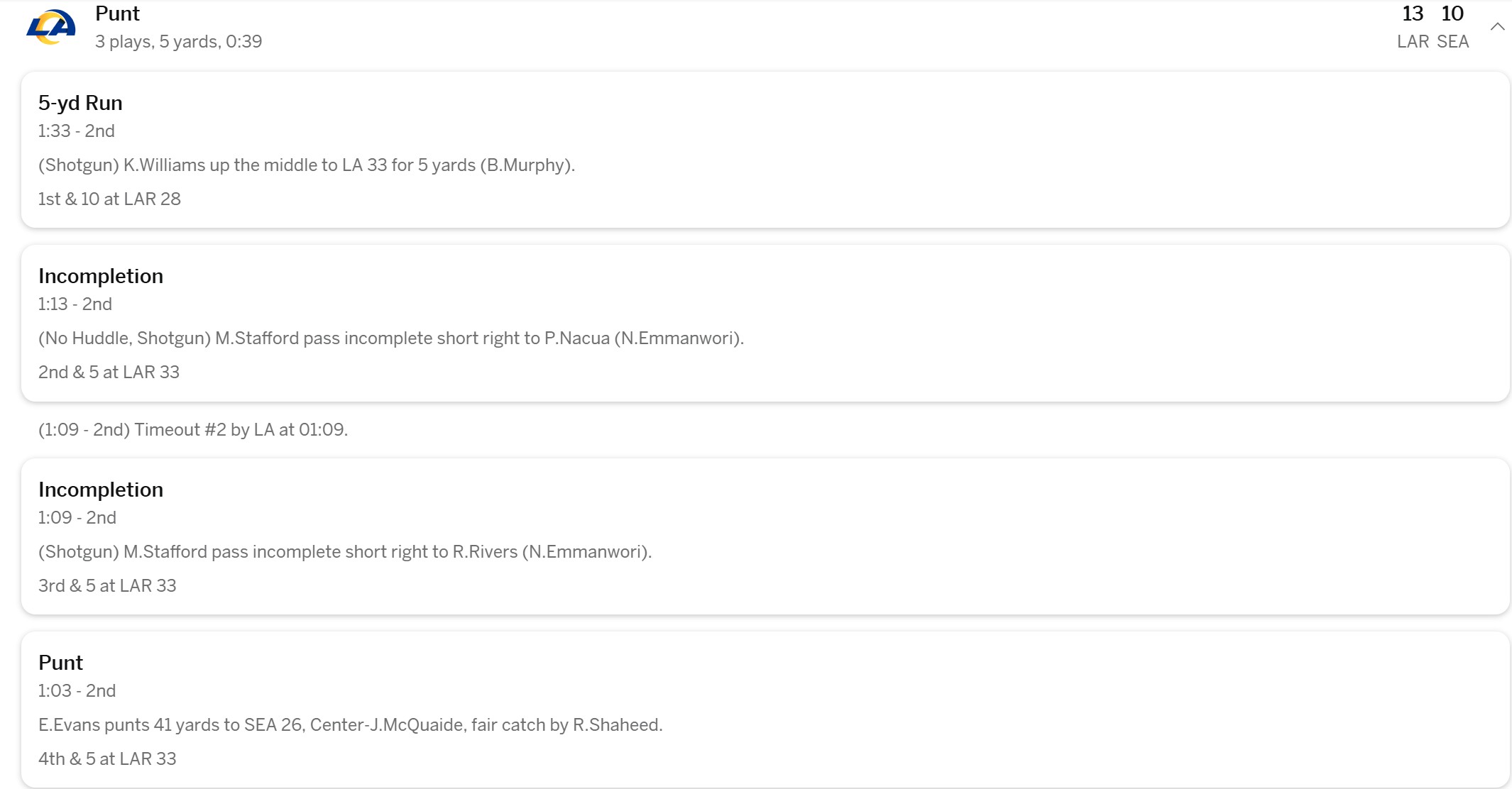 The Rams defense got into the 3rd down they needed but they could never come up with the big play on 3rd down consistently to get off the field. Kupp’s catch gave the Seahawks a brand new set of downs and allowed them to drain another 3 minutes of game clock.