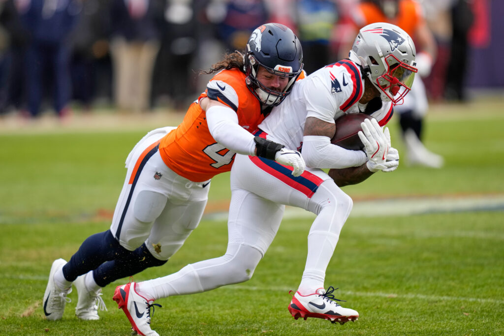 New England Patriots wide receiver Stefon Diggs is tackled by Denver Broncos linebacker Alex Singleton during the first the half of the AFC Championship NFL football game, Sunday, Jan. 25, 2026, in Denver. (AP Photo/John Locher)