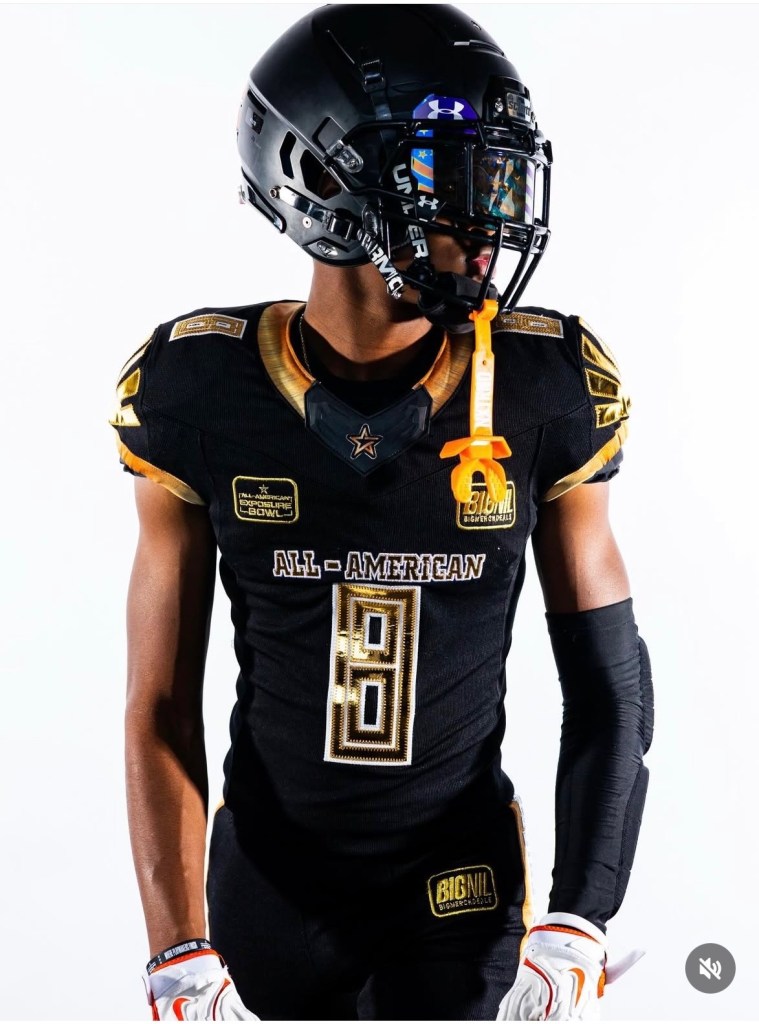 Eighth grader Emanuel Woods poses in his All-star uniform. Woods participated in the All-American Exposure Bowl in Orlando, Florida.