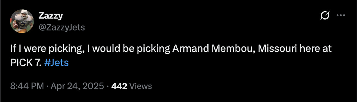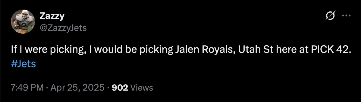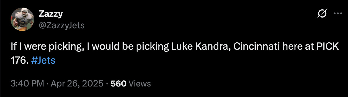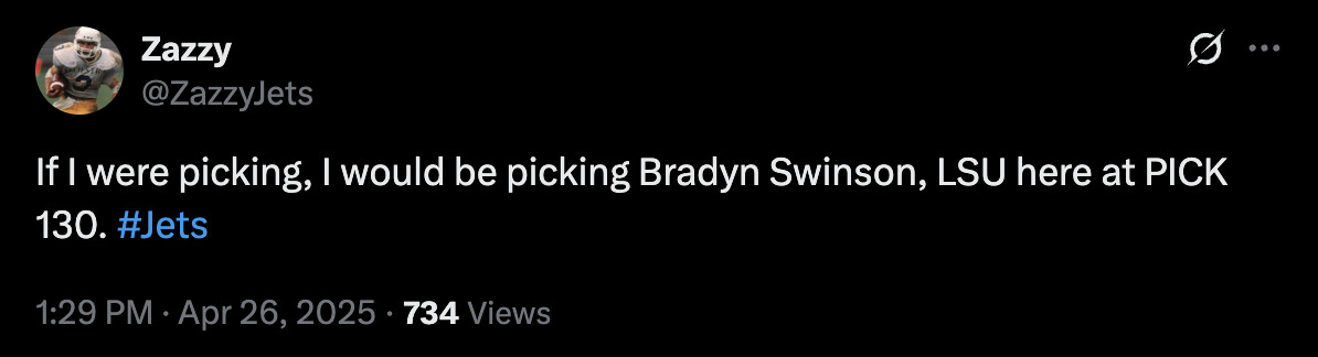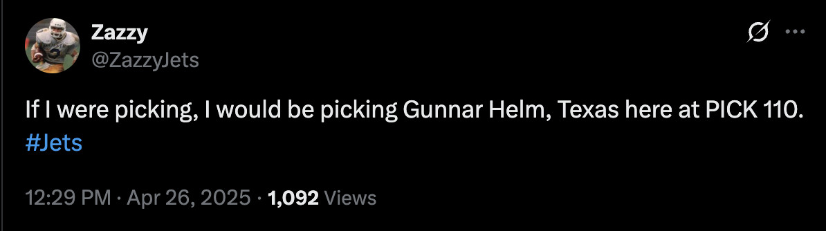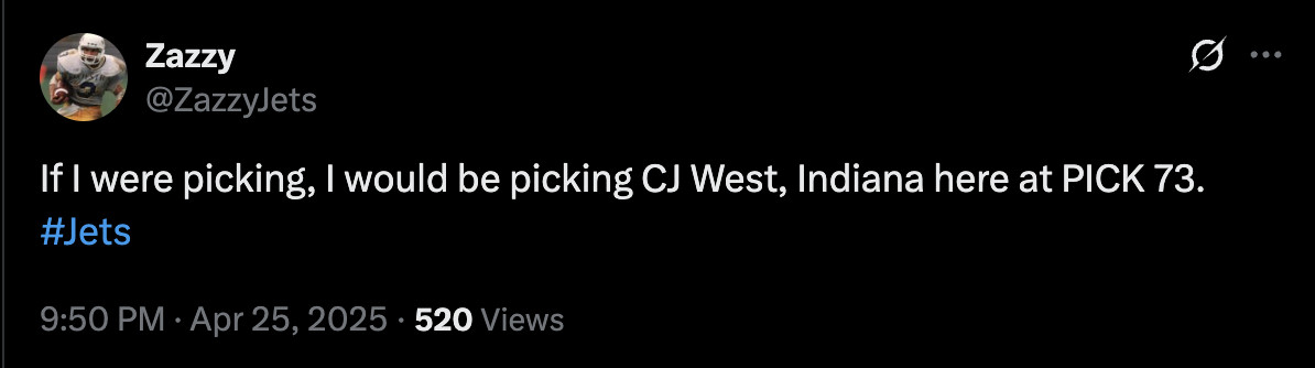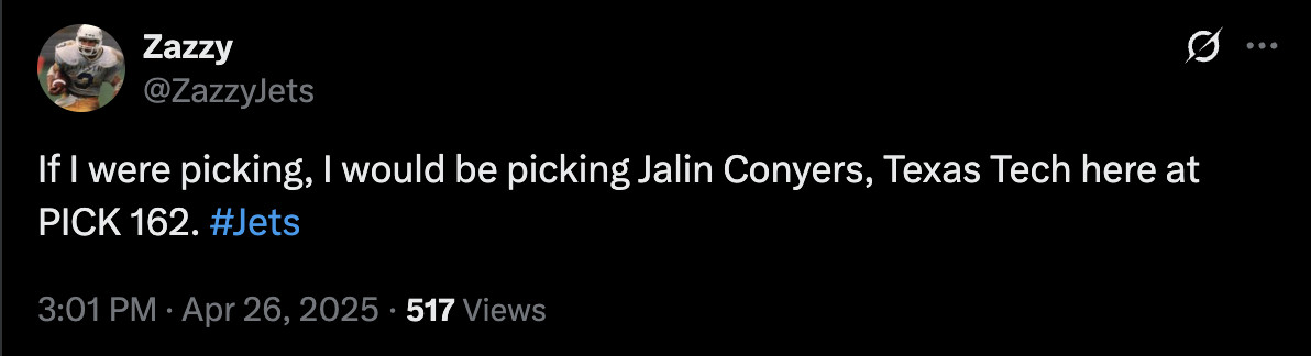 For this pick I wanted to fill out the last “big need” for the Jets with a TE. Helm probably slid down boards because of his testing, but the guy hurt himself and decided to finish the testing regardless. That speaks to his toughness, which we could use at TE. He is a very well rounded prospect with a very high floor. He seems safer than a guy like Taylor. Also a lot safer than the guy Mouglenn picked in Arian Smith. Smith is a speed demon and almost always open. His issues is that he has a HUGE drop problem. He has some really bad ones, and some that really crushed Georgia in games. He will need to clean that up. Another big upside pick that needs a lot of growth.