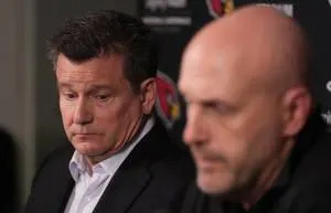 Arizona Cardinals owner Michael Bidwill and general manager Monti Ossenfort speak to the press from the Arizona Cardinals training center in Tempe after the decision to fire head coach Jonathan Gannon on Jan. 5, 2026.
