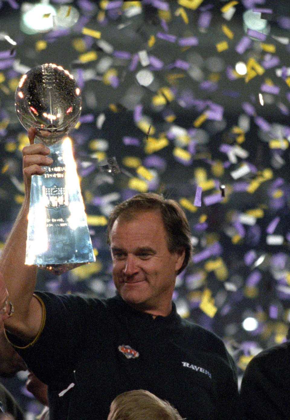 Brian Billick celebrates with the Vince Lombardi Trophy after defeating the New York Giants in Super Bowl XXXV.