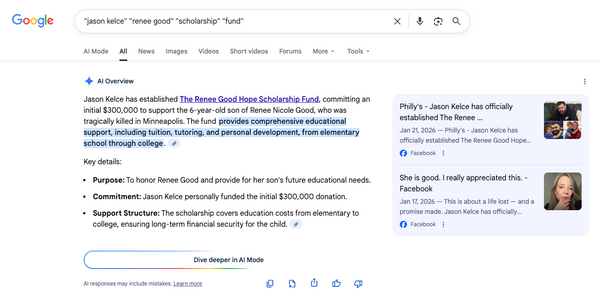 Searches of Bing, DuckDuckGo and Yahoo found no news media outlets reporting about Kelce establishing a scholarship fund in Good’s name. A Google search did, however, mistakenly produce an AI-generated answer wrongly confirming the rumor as true. That AI answer displayed two Facebook posts as the alleged authoritative sources for the false information. Outlets would have widely reported on the story involving Kelce and Good, had it truly occurred.
