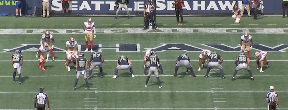 The adjuster for the 49ers was Dee Winters in 2025, who lined up on the edge 78 times last season. Here’s an example of Winters walking down to the edge in Week 1 on the left side of the screen. Next to him is Mykel Williams, with Jordan Elliott at nose, Kalia Davis as the other defensive tackle, and Bosa on the opposite edge.