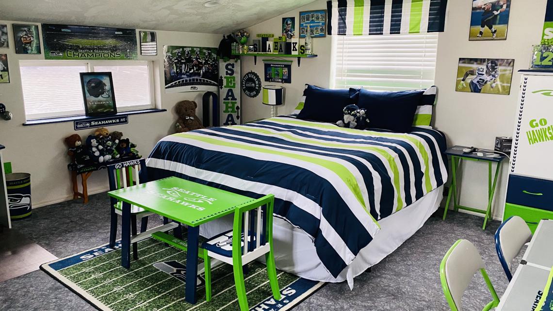Inside, the Seahawks theme continues, with multiple rooms game-day ready and decked out in team colors and memorabilia.Â