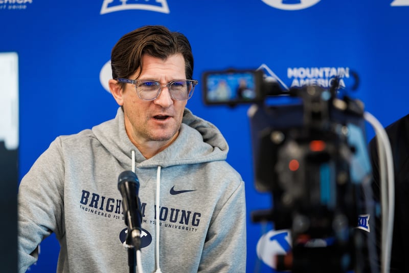 BYU offensive coordinator Aaron Roderick fields questions during Signing Day media availability in Provo, Feb. 4, 2026. | BYU Photo