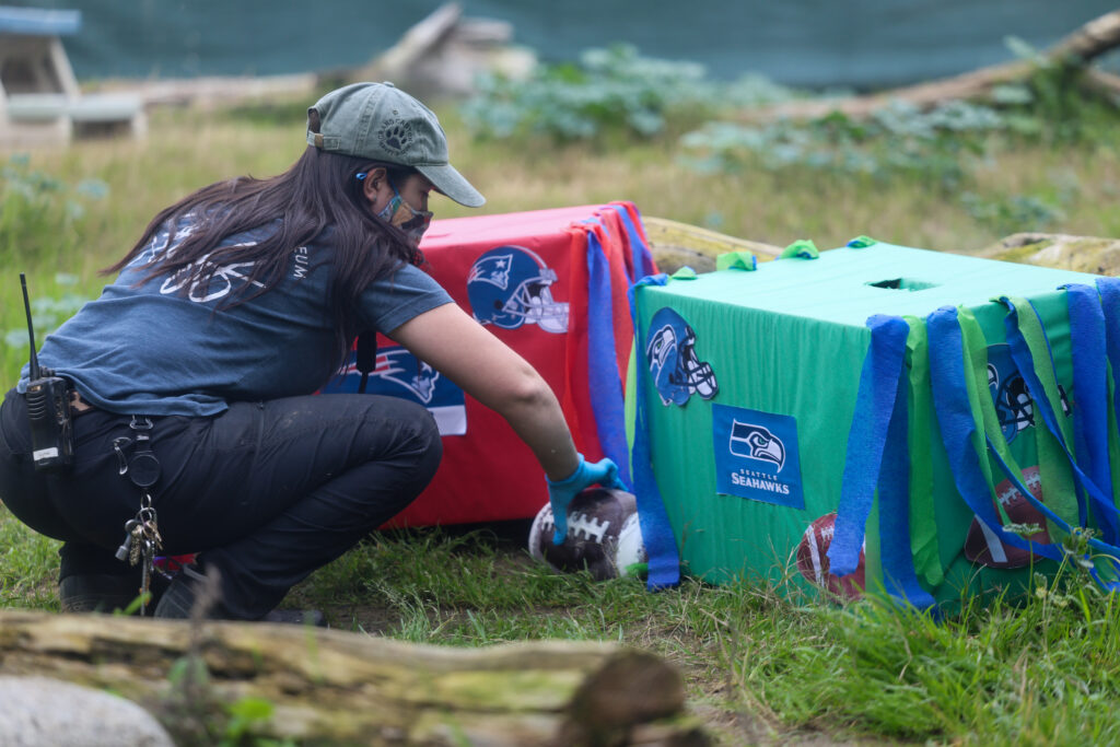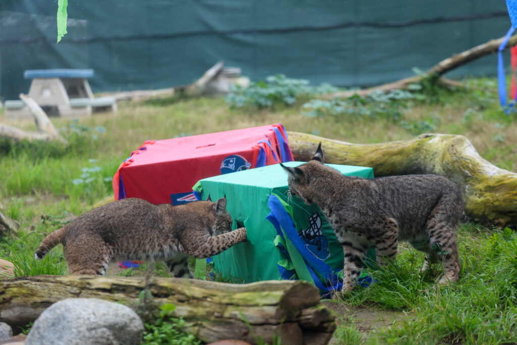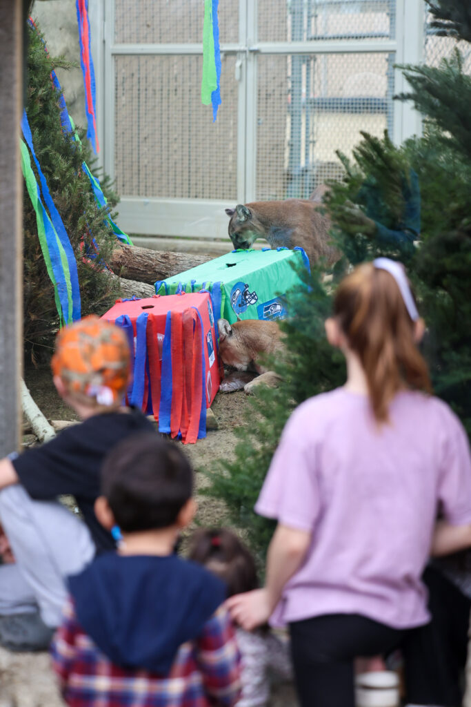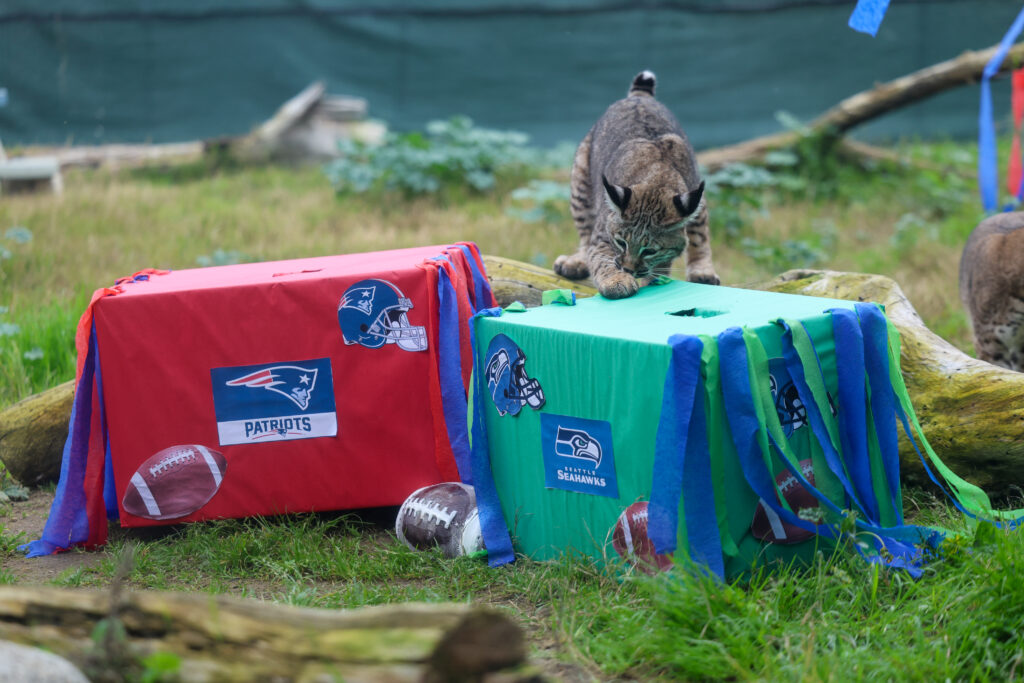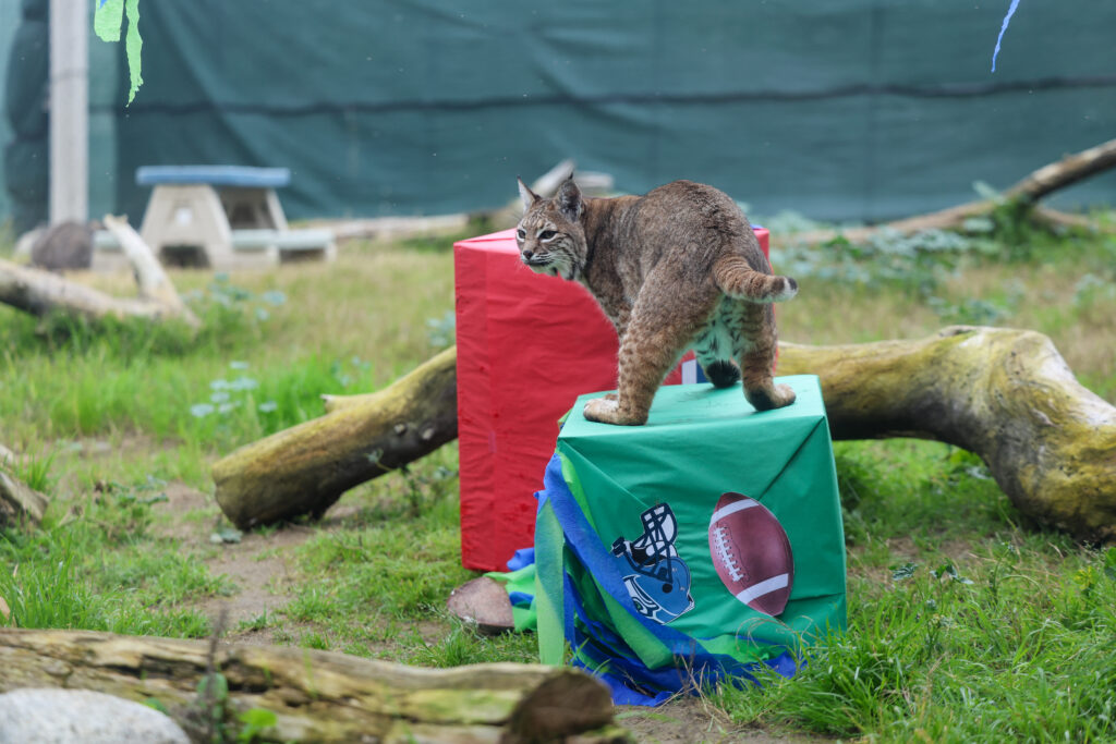 Visitors gathered today at the CALM Zoo for the annual Super Bowl prediction, where the Cats of California once again stepped into the spotlight to forecast the championship outcome. Mountain lions Laurel, Misty, and Sage, along with bobcats Roxy, Rufus, and Coco, took part in the fan-favorite tradition by choosing between two decorated enrichment boxes, each representing one of the competing teams. When the cats eagerly tore into their selected box, the decision was clear — their official pick for this year’s Big Game: the Seattle Seahawks.
