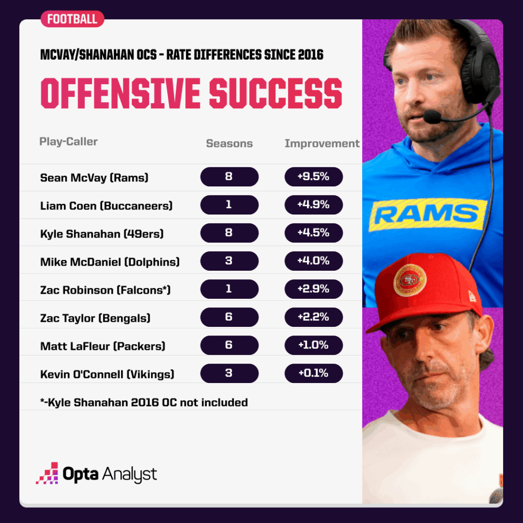 A study by Tyler Greenwalt of TheAnalyst.com shows that McVay improved L.A.’s success rate by a whopping 9.5%, while Liam Coen improved the Buccaneers’ by 4.9% in 2024. Coen was rewarded with the head coaching position of the Jacksonville Jaguars in 2025 for his efforts.