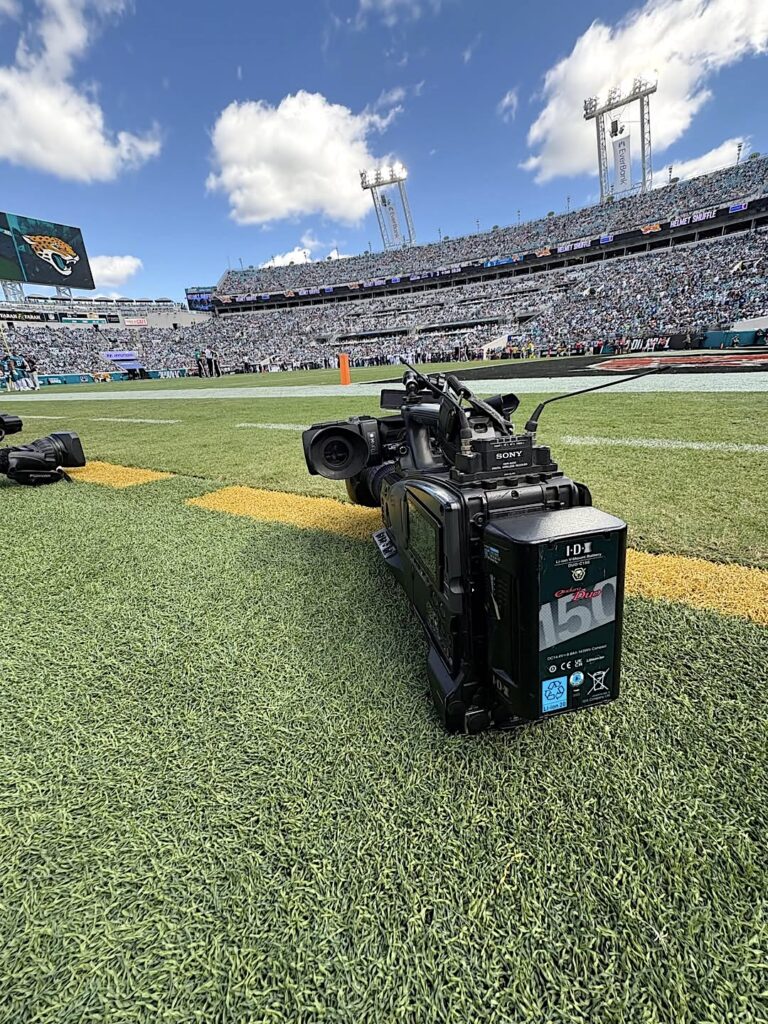 Schroeder’s camera equipment positioned on field at EverBank Stadium in Jacksonville, Fla. on Oct. 12, 2025, during the Jacksonville Jaguars v. Seattle Seahawks game. The Seahawks took down the Jaguars, 20-12. PHOTO COURTESY OF STEPHANIE SCHROEDER/FACEBOOK