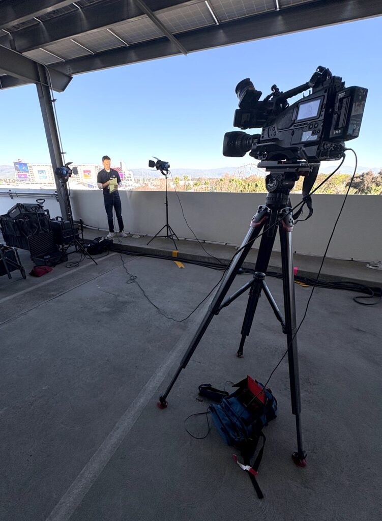One of the many live shots Schroeder has been doing for Fox 13 Seattle in San Jose, Calif. this past week ahead of Super Bowl LX. The NFL set up the compound with a view of Levi’s Stadium for media outlets to utilize. PHOTO BY STEPHANIE SCHROEDER