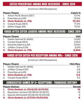 But even these numbers surprised Joe. Since 2019, Arians’ first year with the Bucs, only two NFL receivers have a better catch percentage than Godwin. That’s Amon-Ra St. Brown with the Lions and Puka Nacua with the Rams.