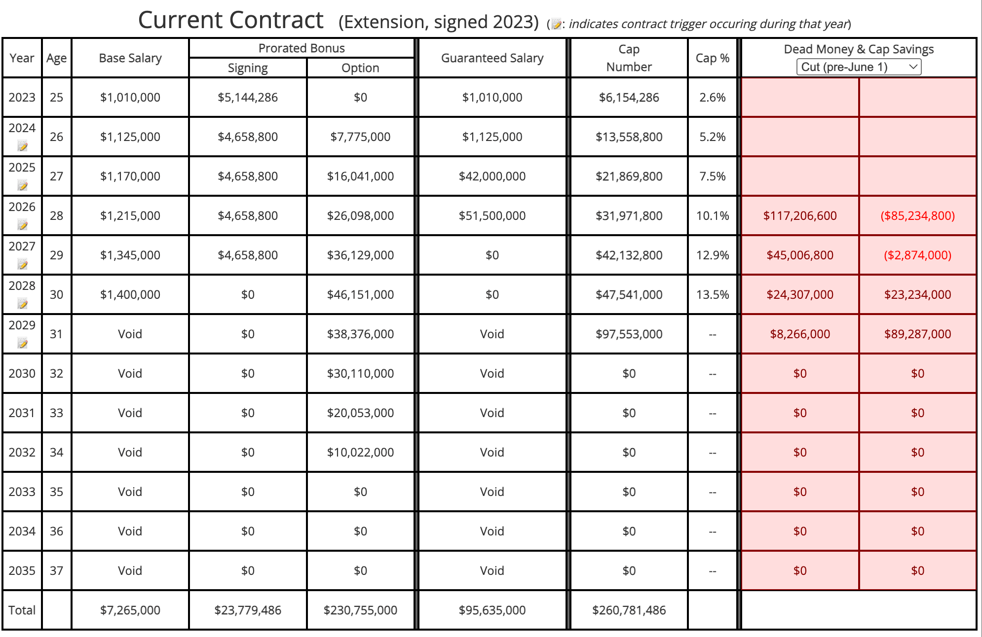 What you see is that Hurts’ contract to play for the Eagles actually runs only through 2028. The Eagles used what is called an option bonus as part of the structure. Bonuses are, for accounting purposes, pro-rated over the life of a contract. The years listed as “void” are actually years that Hurts won’t play for the Eagles without a new contract. What you see is that for accounting purposes $97.553 million in bonuses have been prorated over years that actually don’t exist. The contract will void in 2029, and the Eagles will be hit with that $97 million cap charge.