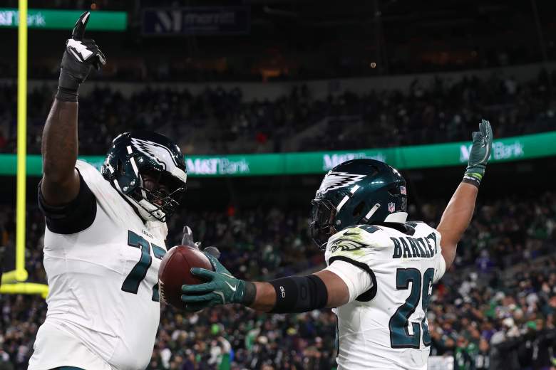 BALTIMORE, MARYLAND – DECEMBER 01: Saquon Barkley #26 of the Philadelphia Eagles celebrates his touchdown run with Mekhi Becton #77 during the fourth quarter against the Baltimore Ravens at M&T Bank Stadium on December 01, 2024 in Baltimore, Maryland. Philadelphia defeated Baltimore 24-19. (Photo by Patrick Smith/Getty Images)