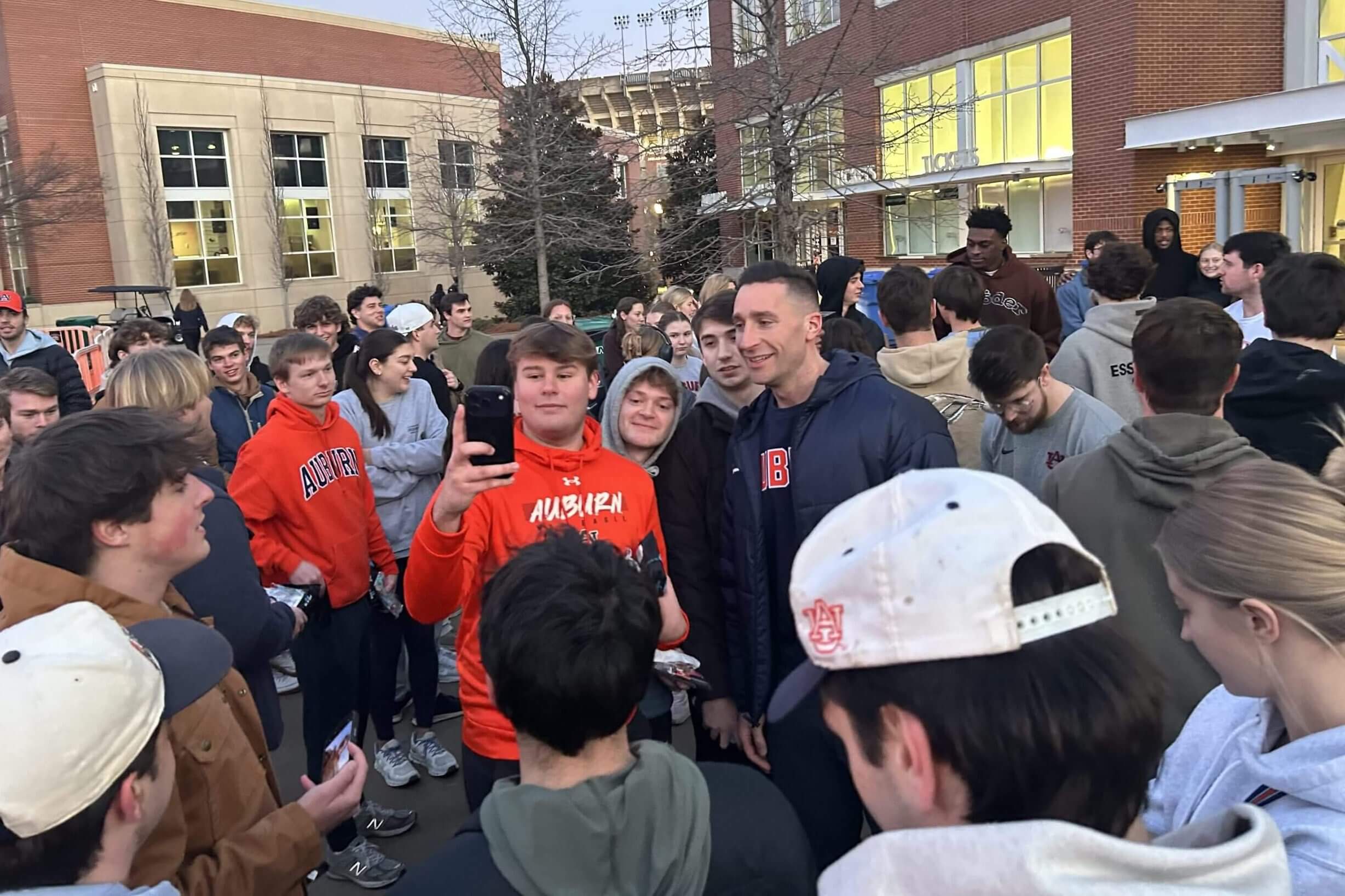 Auburn coach Steven Pearl talks with students on Friday afternoon, the day before the Alabama game. (Joe Rexrode)
