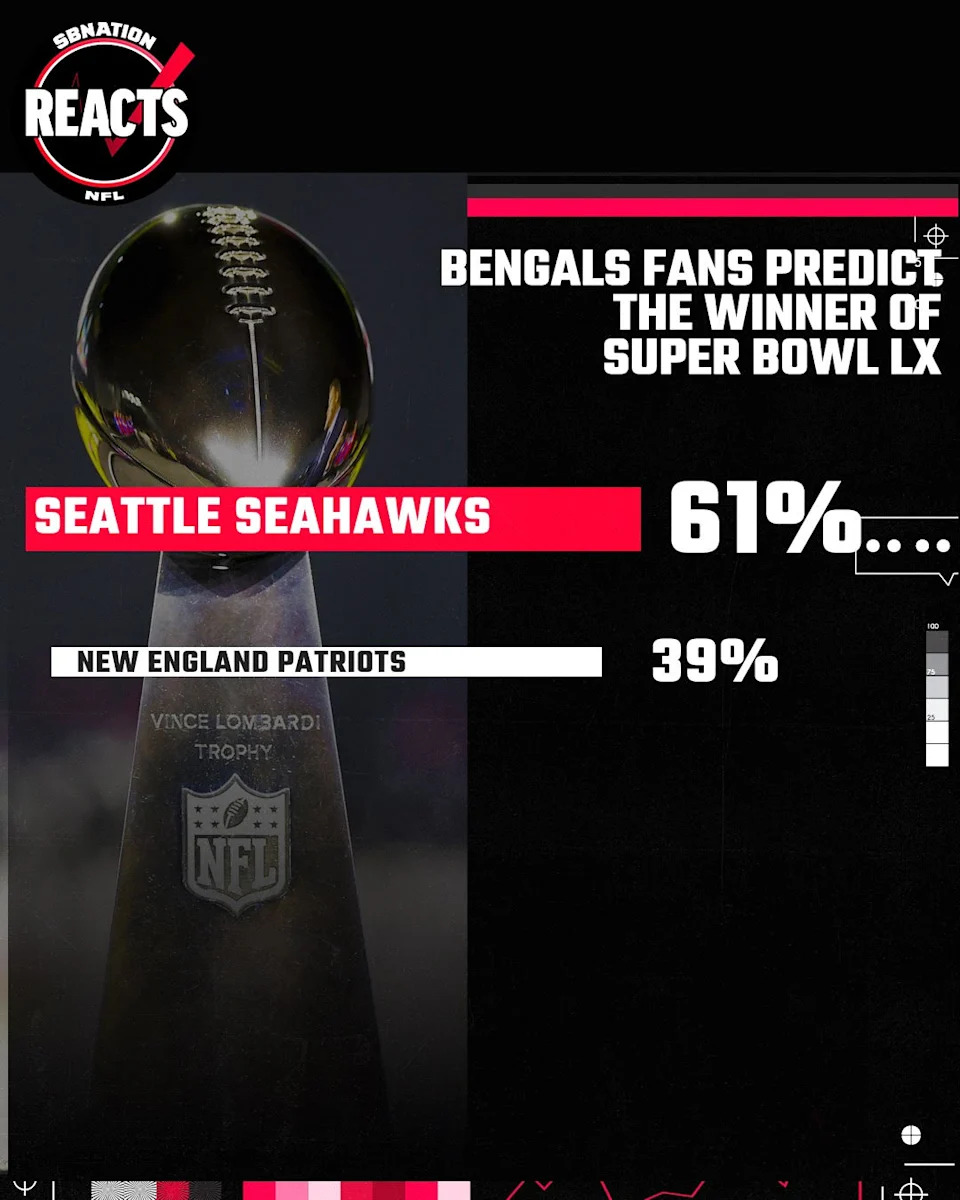 The Bengals don’t have a lot at stake on Sunday, but that doesn’t mean they won’t be tuning in. According to a recent SB Nation poll, 61% of Bengals fans predict it will be Darnold and the Seahawks that hoist the Lombardi when it’s all said and done.