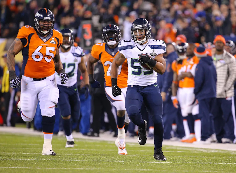 Super Bowl XLVIII (Seahawks 43, Broncos 8): Seattle Seahawks linebacker Malcolm Smith (53) returns an interception for a touchdown against the Denver Broncos at MetLife Stadium.