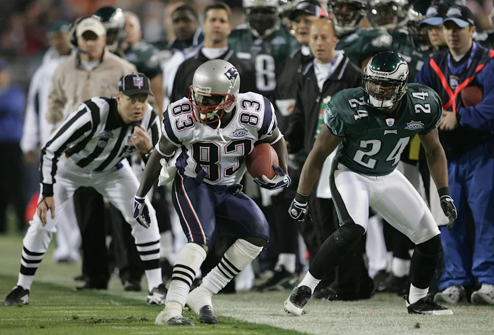 Super Bowl XXXIX (Patriots 24, Eagles 21): Wide receiver Deion Branch catches a pass in front of the Philadelphia Eagles’ Sheldon Brown (24)during the second quarter at Alltel Stadium in Jacksonville, Florida. Branch had 11 catches for 133 yards and was named the game’s MVP.