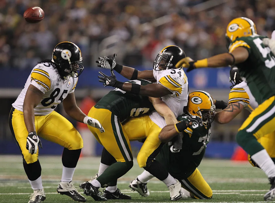 Super Bowl XLV (Packers 31, Steelers 25): Pittsburgh Steelers running back Rashard Mendenhall (34) fumbles after being hit by Green Bay Packers linebacker Clay Matthews (52) during the second half of Super Bowl XLV at Cowboys Stadium.