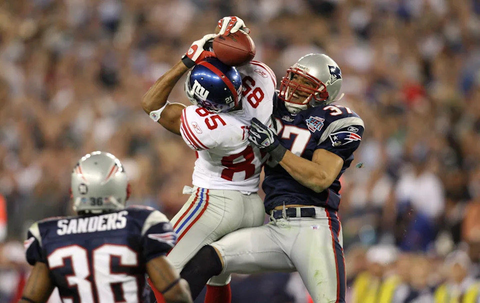 Super Bowl XLVI (Giants 21, Patriots 17): New York Giants wide receiver Mario Manningham (82) makes a catch along the sideline in front of New England Patriots free safety Sterling Moore (29) and free safety Patrick Chung (25) during the fourth quarter at Lucas Oil Stadium.