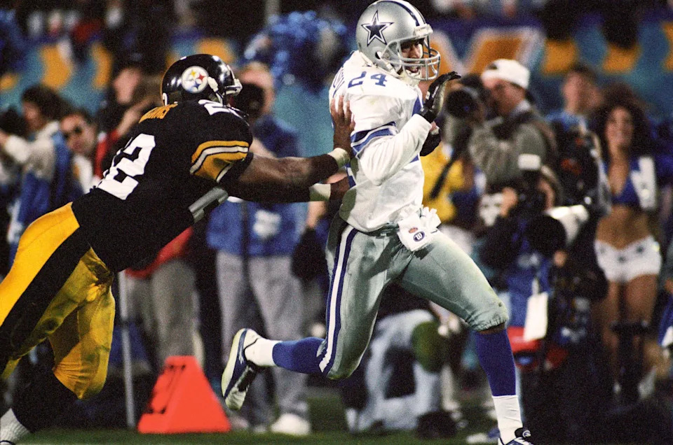 Super Bowl XXX (Cowboys 27, Steelers 17): Dallas Cowboys cornerback Larry Brown (24) runs with the ball after an interception at Sun Devil Stadium. Brown had two interceptions and was named game MVP as the Cowboys won their third Super Bowl in four seasons.