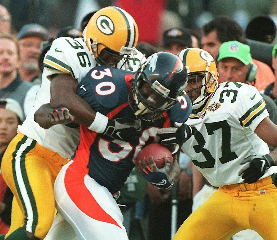 Super Bowl XXXII (Broncos 31, Packers 24): Terrell Davis of the Denver Broncos in action during Super Bowl XXXII at Qualcomm Stadium in San Diego. Davis scored three TDs and was named MVP.