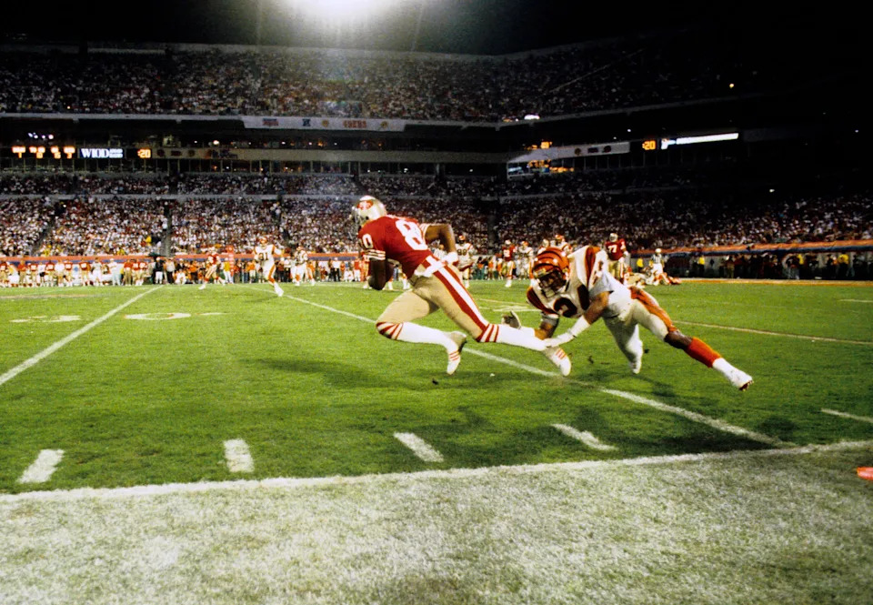 Super Bowl XXIII (49ers 20, Bengals 16): Over 11 plays, the San Francisco 49ers drove 92 yards to secure a narrow victory. Pictured above is wide receiver and game MVP Jerry Rice.