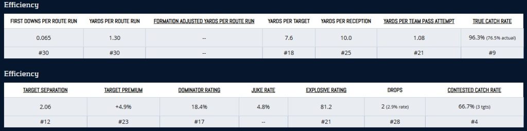 Either way, at TE17 prices on KeepTradeCut, Barner is an interesting player I wouldn’t mind buying in TE-premium formats. Outside of that, I just don’t think the production is worth chasing. His upside seems capped, as he’s unlikely to ever command serious volume. That said, he’s young and relatively affordable, enough to where I wouldn’t mind paying market value to see if he continues this progression.