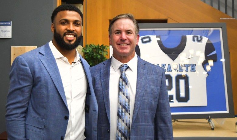 Julian Love (left) with Nazareth Academy head football coach Tim Racki and his retired No. 20 jersey. (Courtesy of Nazareth Academy)