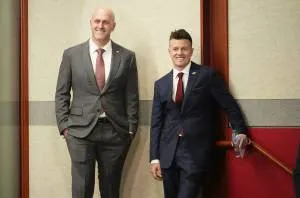 Arizona Cardinals general manager Monti Ossenfort (left) with his new head coach Mike LaFleur at a news conference on Feb. 3, 2026, at Arizona Cardinals training center in Tempe.