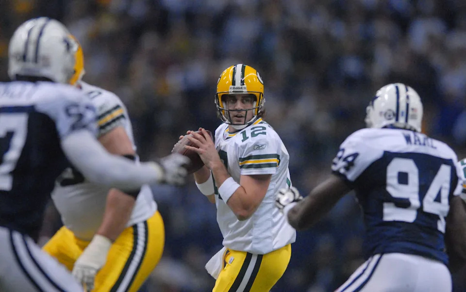 Green Bay Packers quarterback Aaron Rodgers drops back to pass against the Dallas Cowboys at Texas Stadium on Nov. 29, 2007.